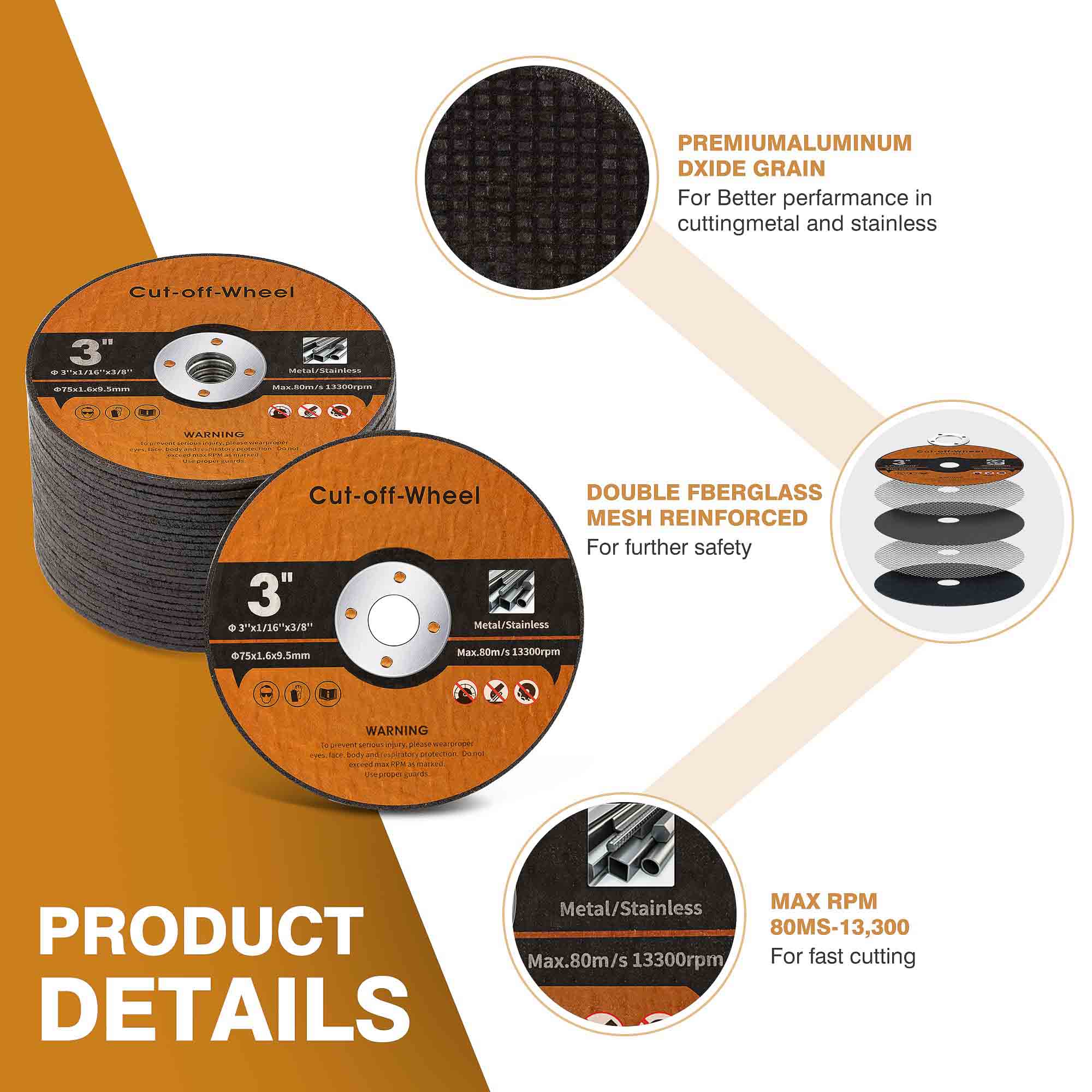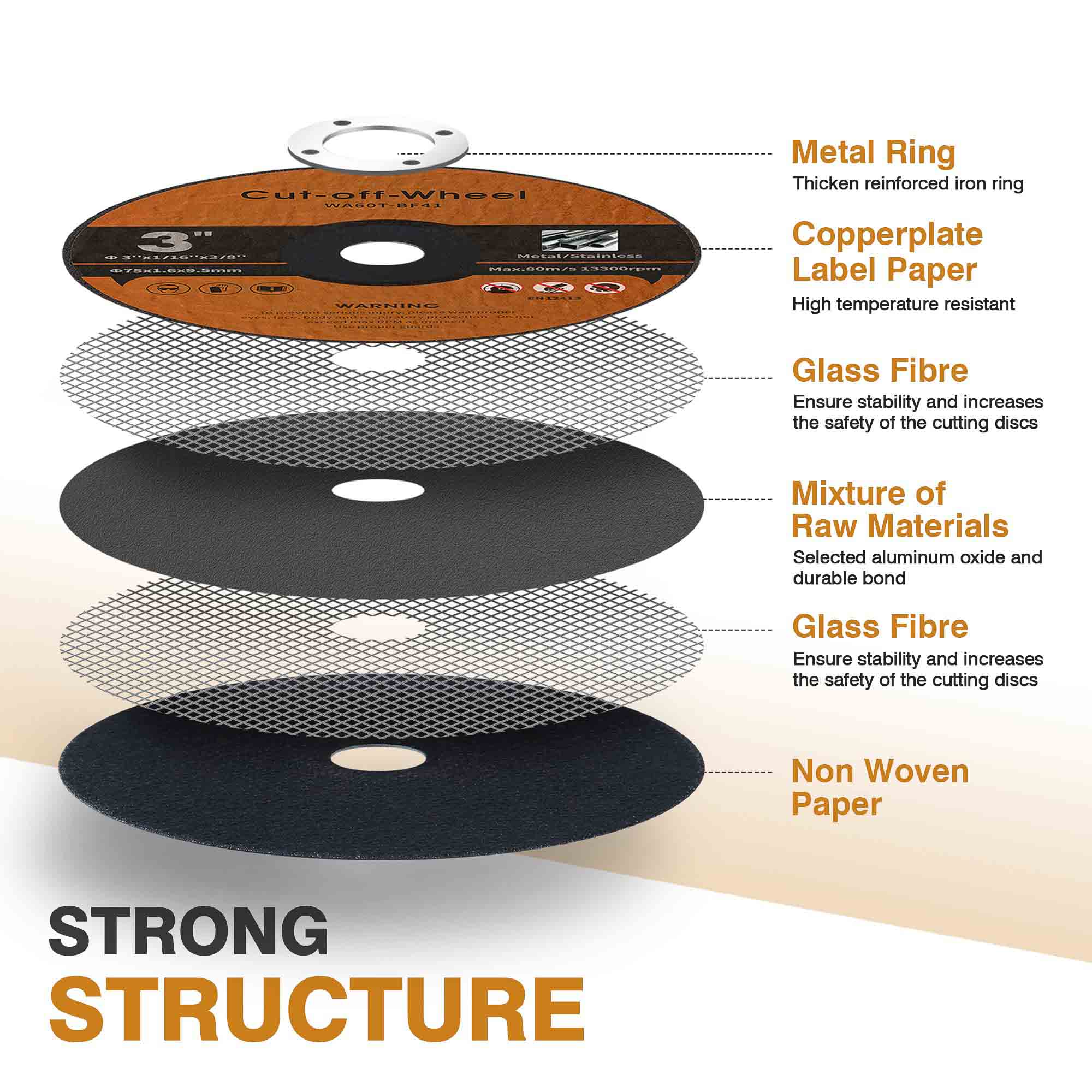 O núcleo de malha de fibra de vidro de camada dupla fornece: resistência a rasgo de 360 ° durante a operação de alto rPM, proteção à prova de explosão sob cargas pesadas, amortecimento de vibração para cortes mais suaves, integridade estrutural, mesmo em velocidades operacionais máximas.